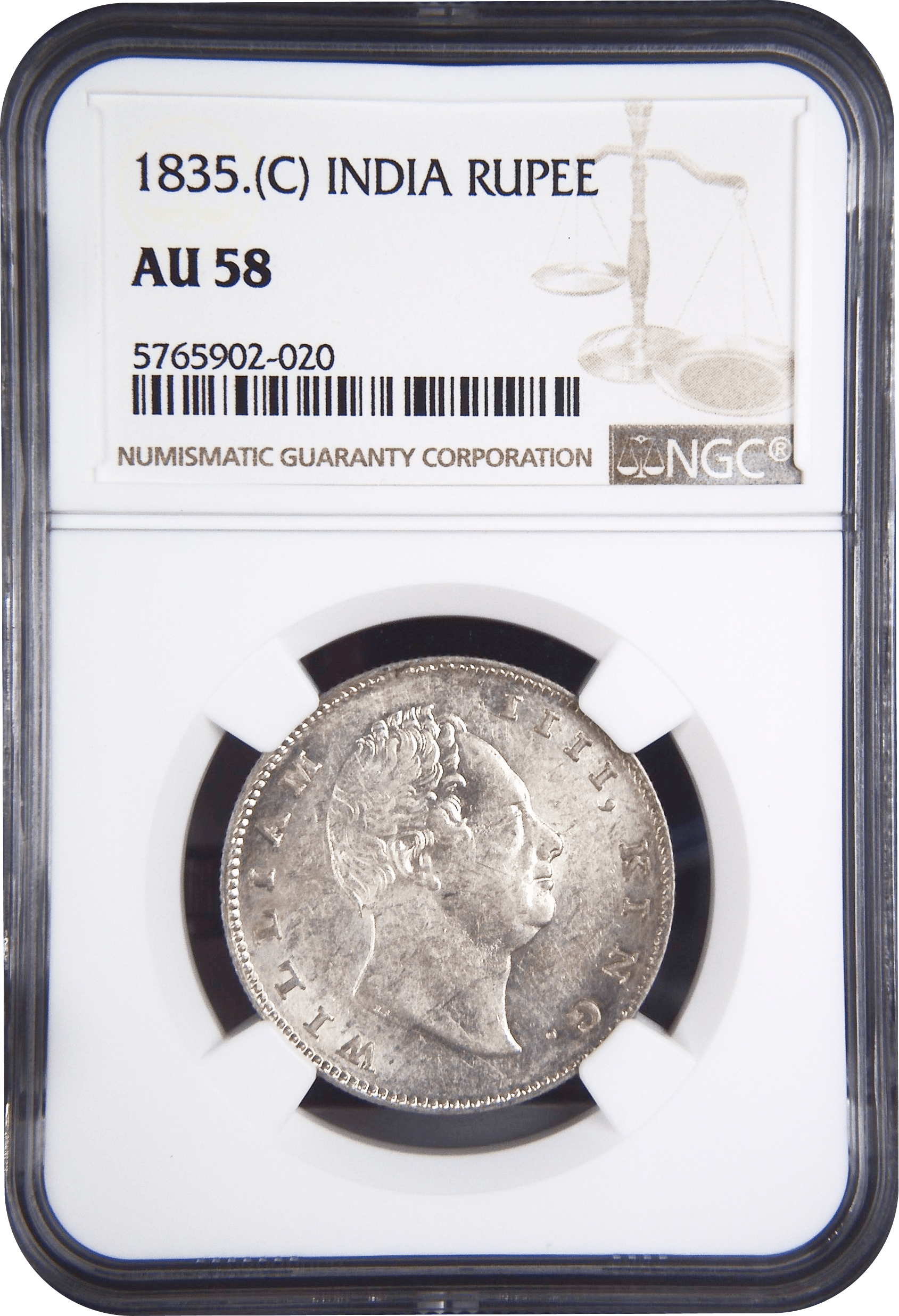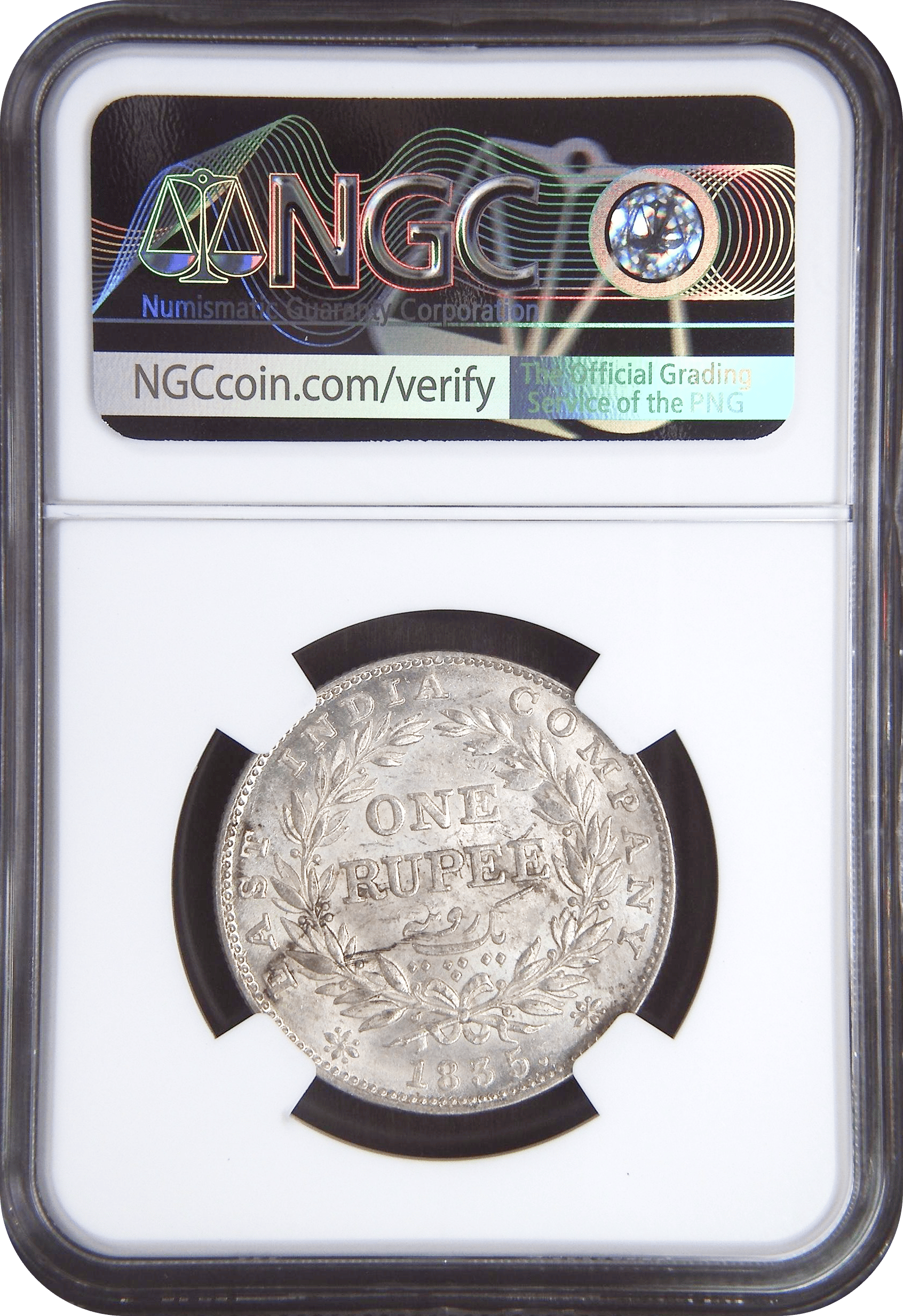 イギリス東インド会社による統治下の1835年に、カルカッタミントで製造されたルピー銀貨です。