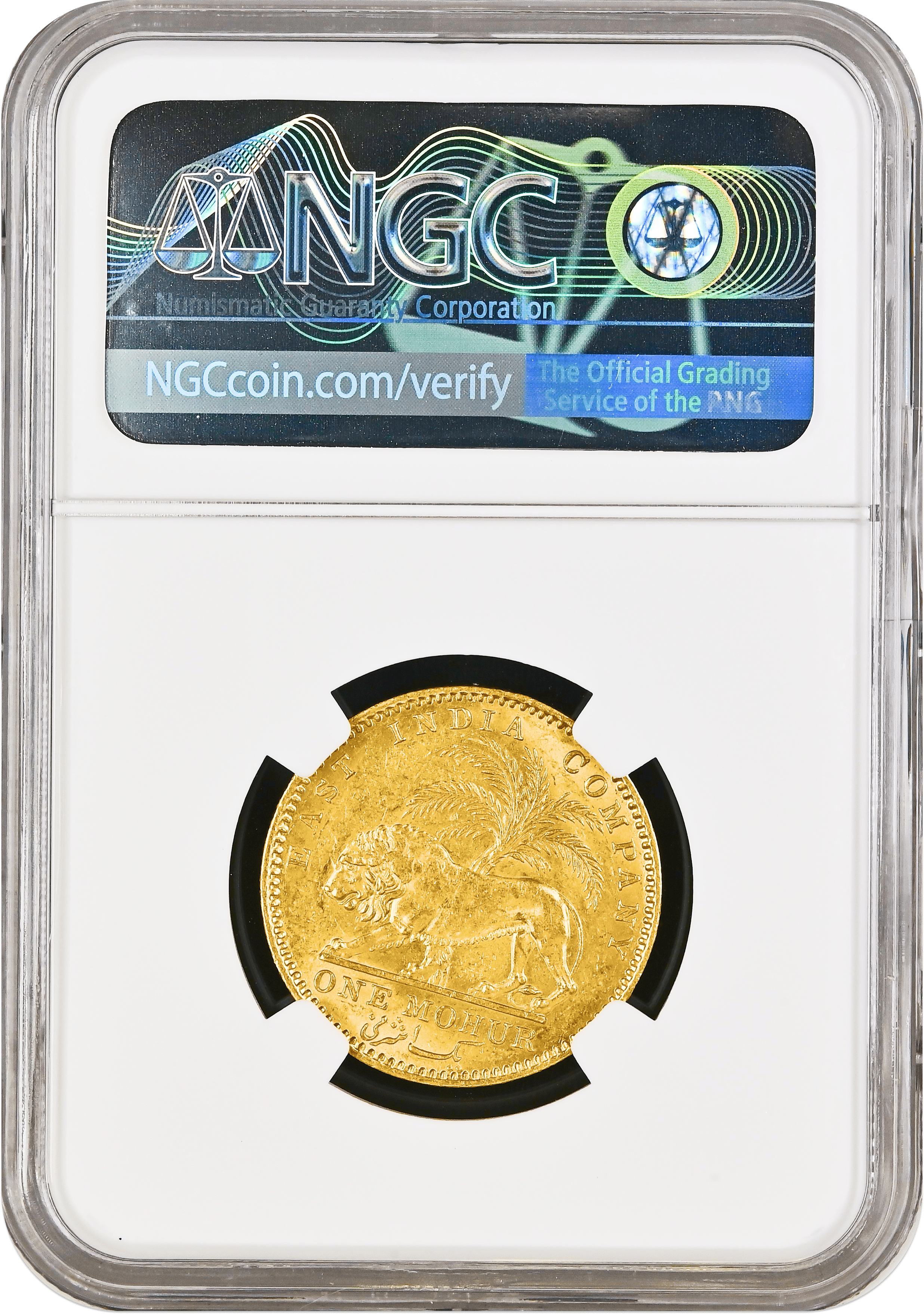 インド国外への持ち出しが禁止されていることから市場に現れる数は非常に少なく、ワイオンによる気品あるヴィクトリア女王の肖像、裏面に描かれた椰子の木とライオンの意匠が際立つ、たいへん魅力的な一枚です。