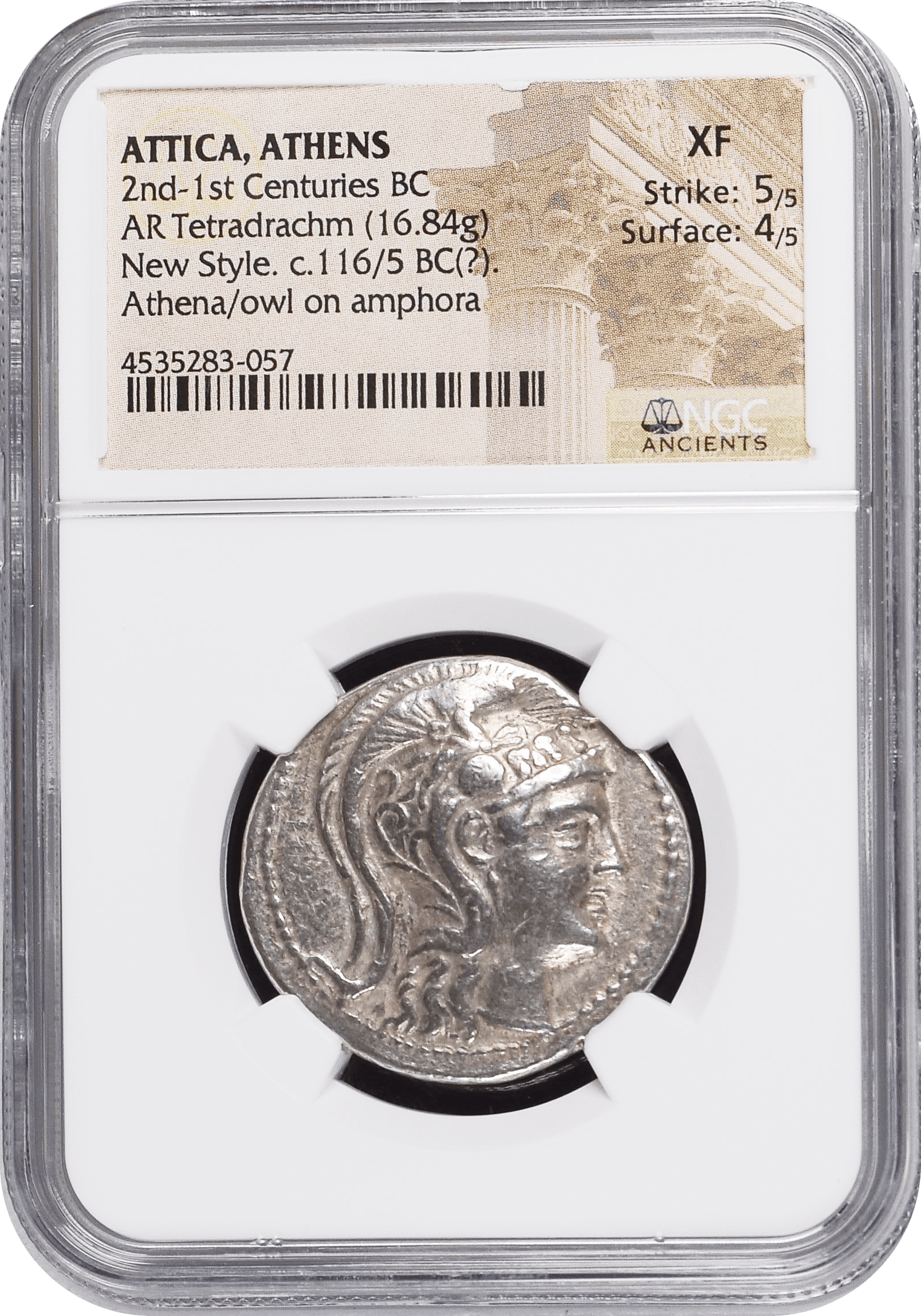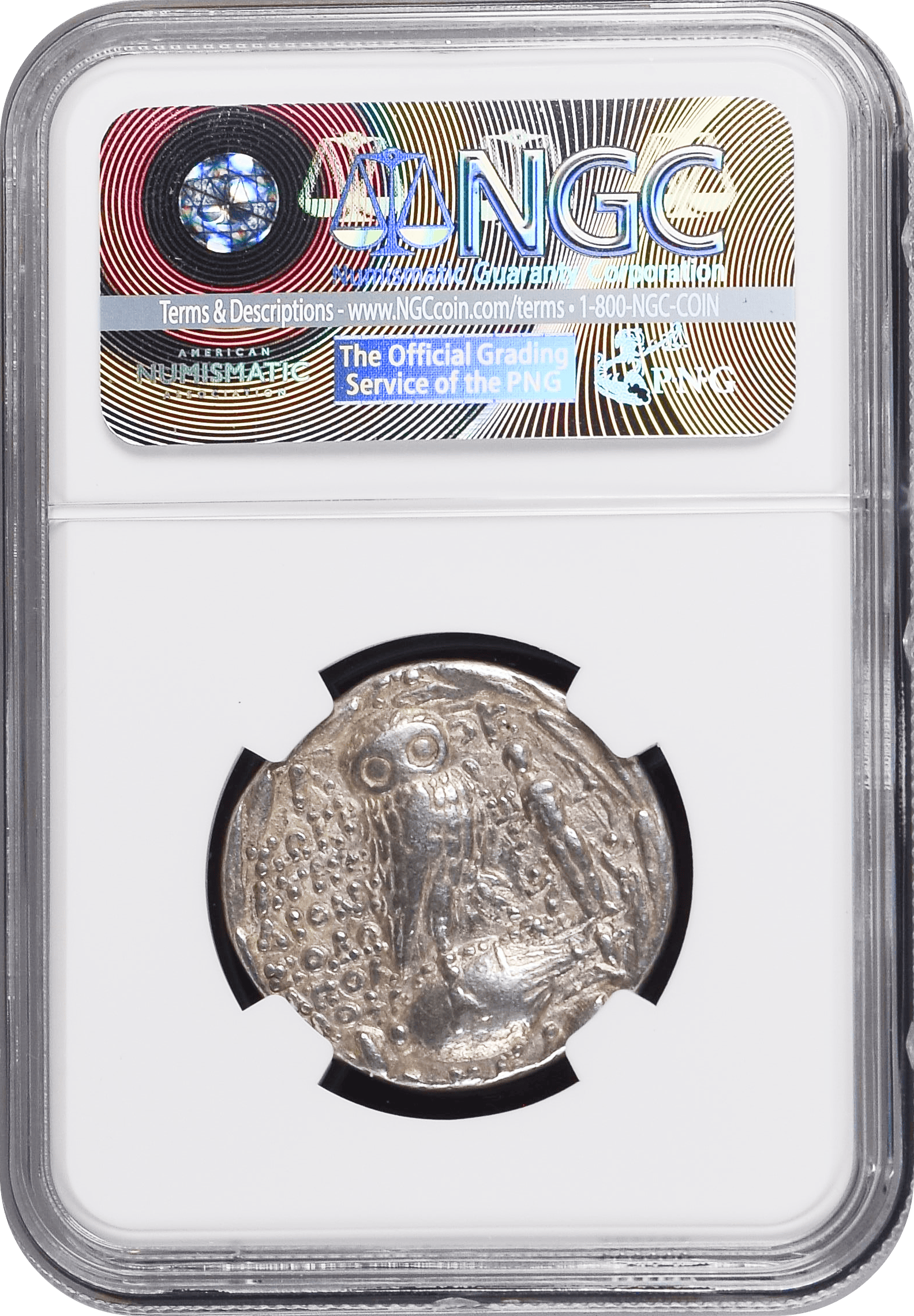アテネとフクロウのテトラドラクマ銀貨の中では、比較的新しい時代に発行されたタイプです。