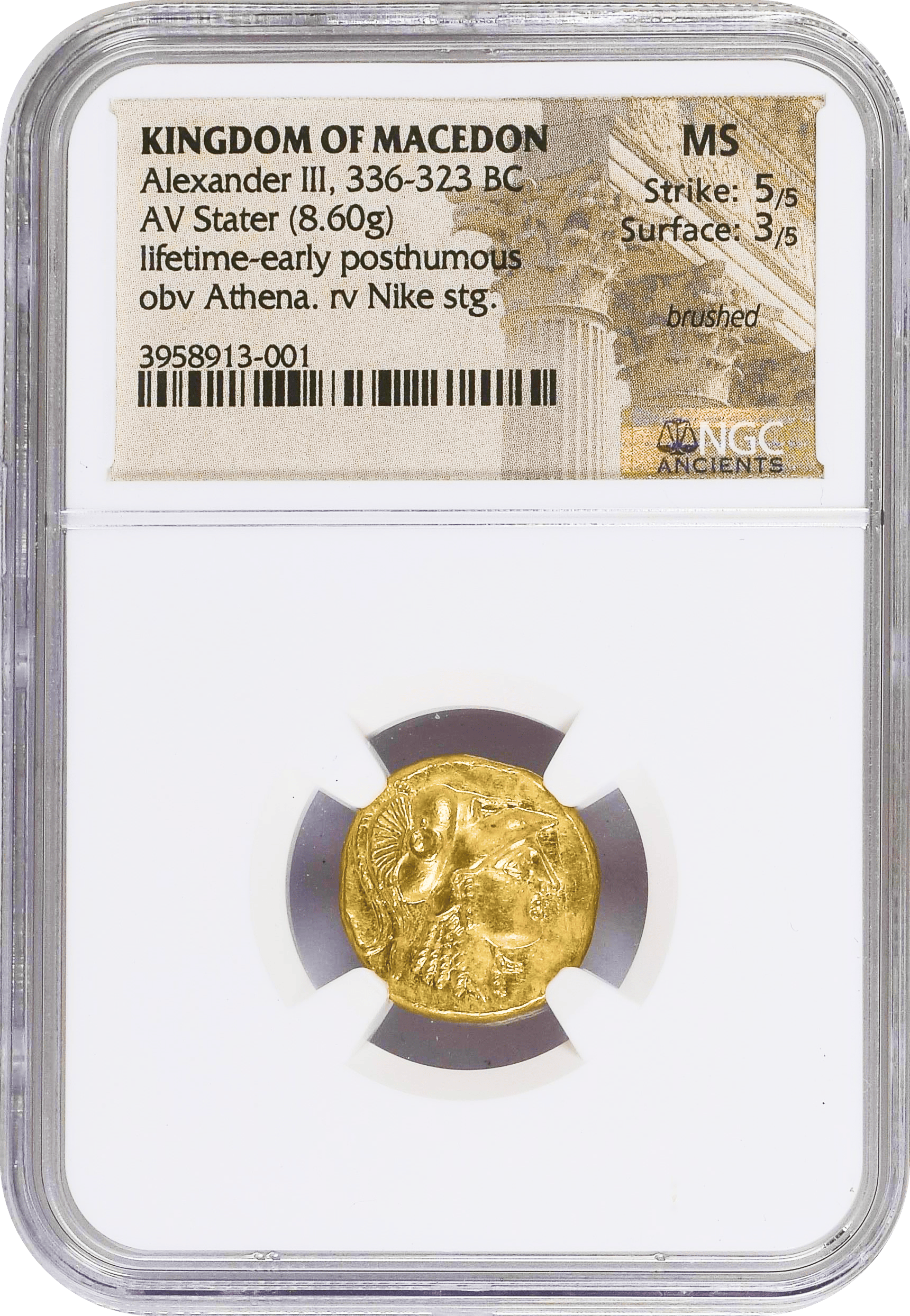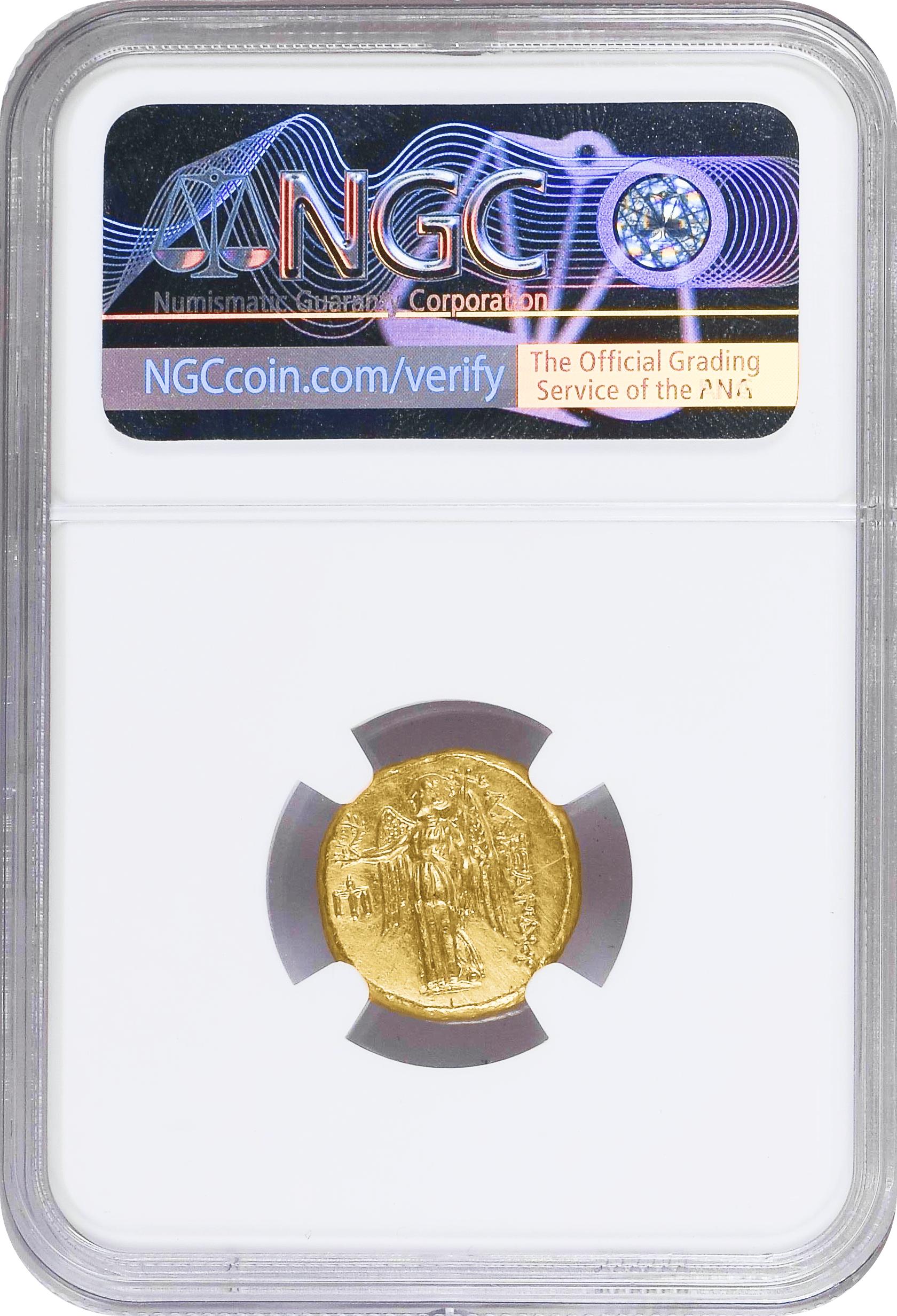 アレキサンダー3世(アレキサンダー大王)の時代に広く製造された金貨で、彼の死後も王国の結束と威厳を示す象徴として各地で発行されました。