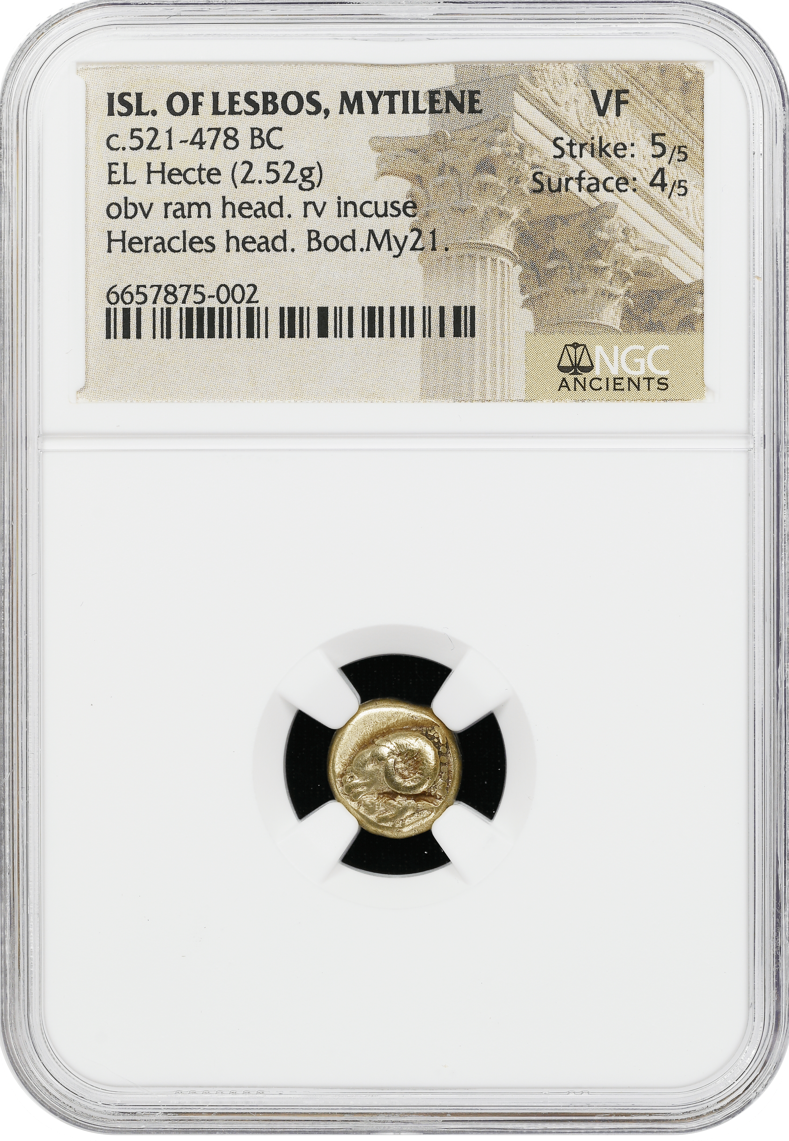 ミティリニは当時、豊かな文化と経済力を誇る都市国家でした。この金貨は、その繁栄を今に伝える、非常に魅力的な一枚です。
