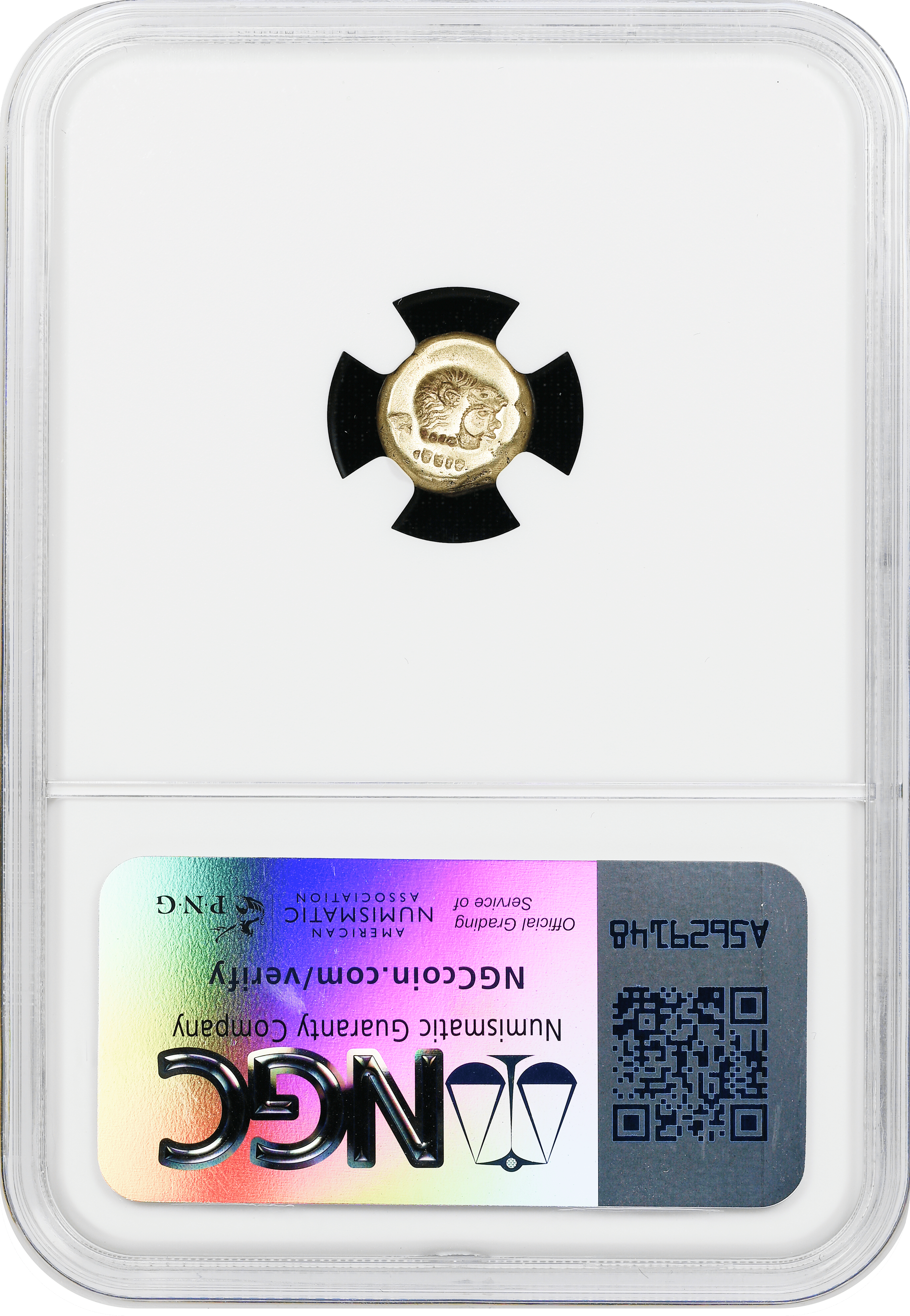その政治・文化の中心であったミティリニで作られた1/6スターテルのエレクトラム(砂金などの自然金銀合金)貨です。