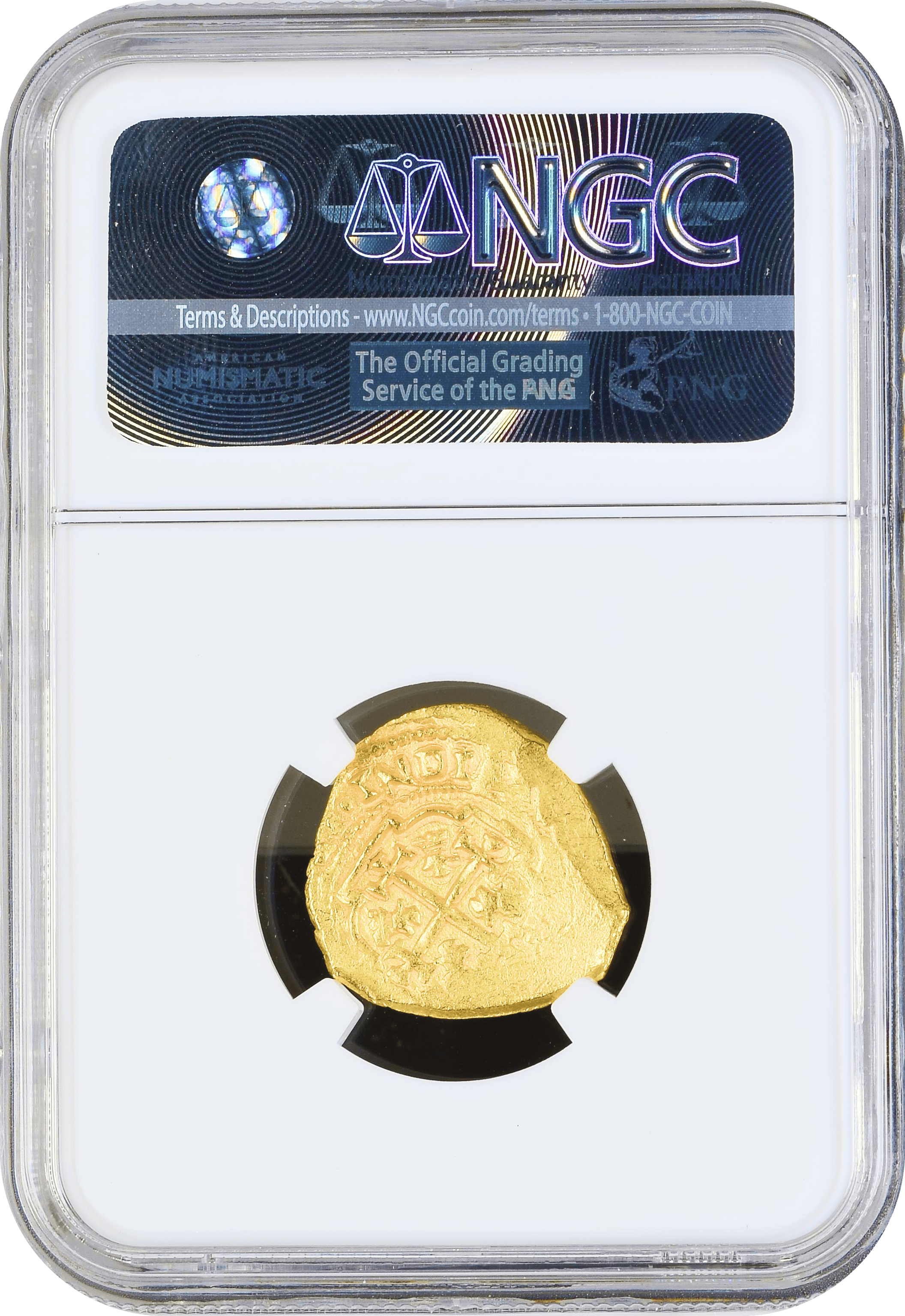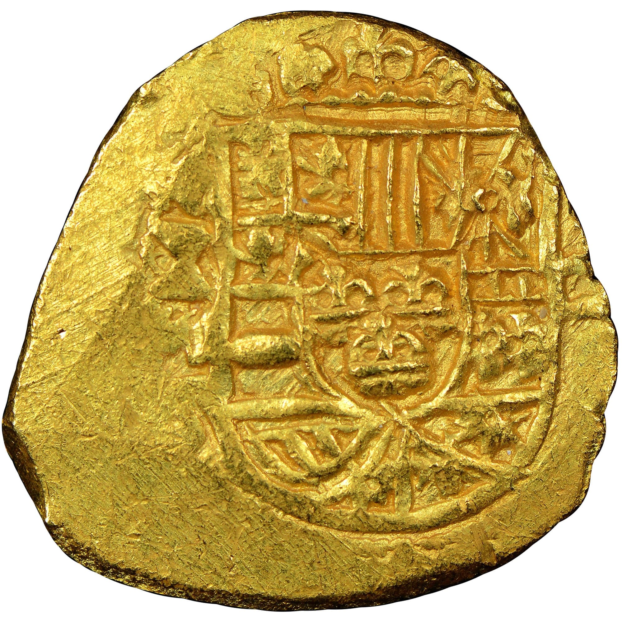表面にはスペイン王家の連合紋章、裏面には城と獅子を配した十字盾意匠が刻まれ、大西洋世界を結んだ帝国の威信を体現しています。