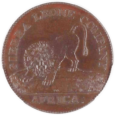 表面には「SIERRA LEONE COMPANY. AFRICA.」の銘とともに、土地の名「ライオンの山」を象徴する堂々たるライオンが刻まれています。