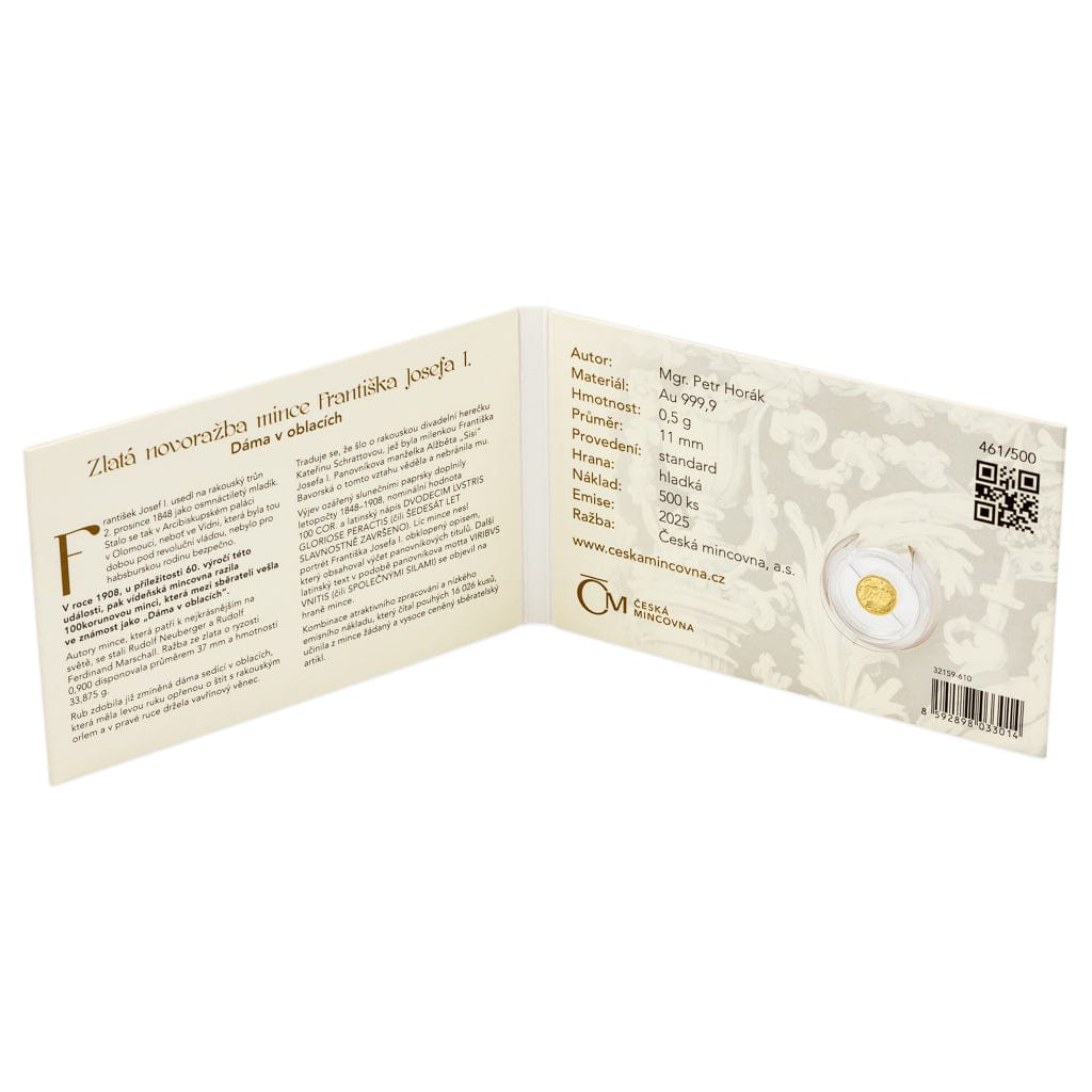 もう片方には皇帝フランツ・ヨーゼフ1世の肖像が描かれ、その周囲には君主の称号が記されています。ルドルフ・ノイベルガーとルドルフ・フェルディナント・マルシャルによる原画を基に、メダル製作者のペトル・ホラークによって新たな彫刻が施されています。