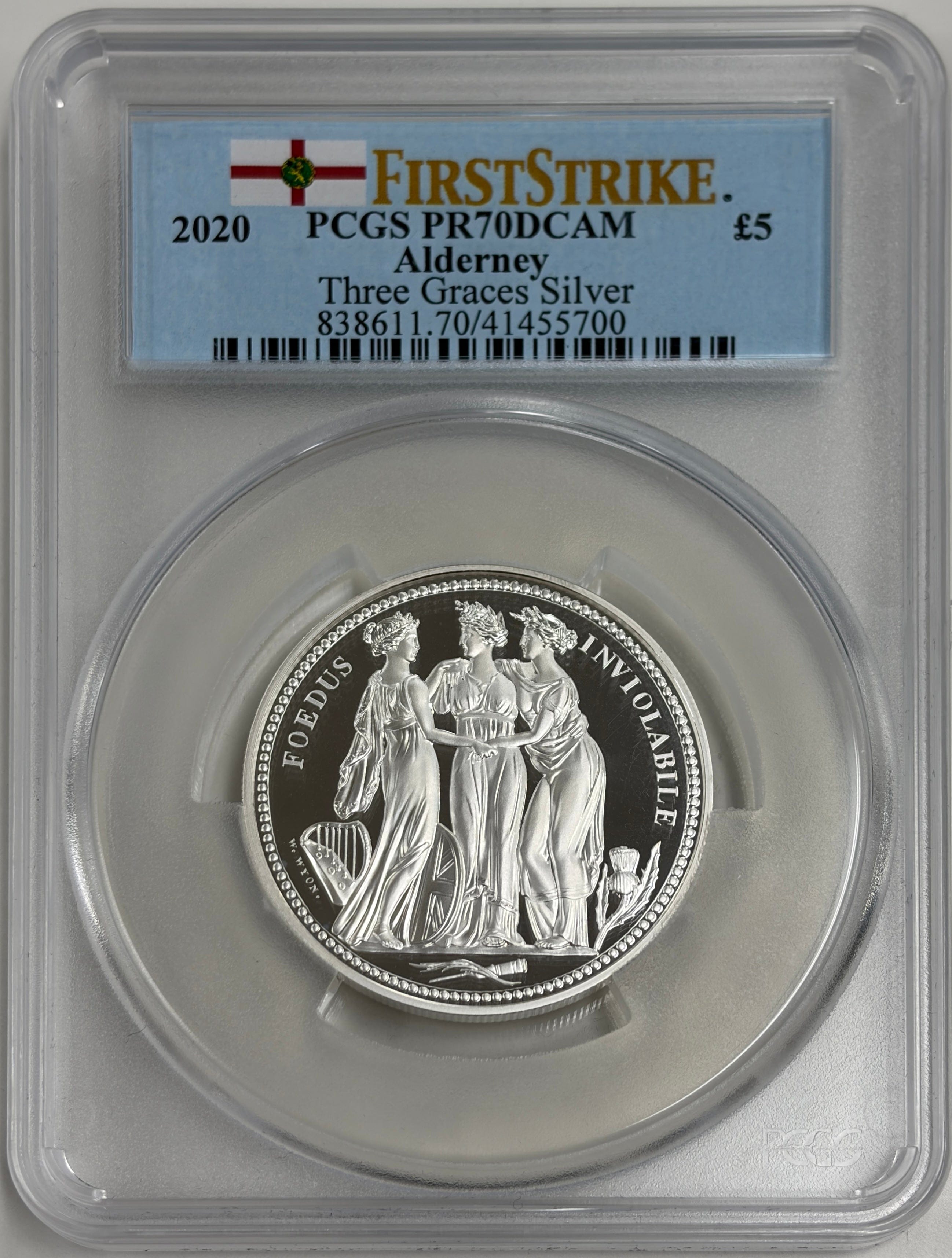 2020年 オルダニー スリー・グレイセス 2oz 5ポンド銀貨 PCGS PR70 Deep Cameo First Strike