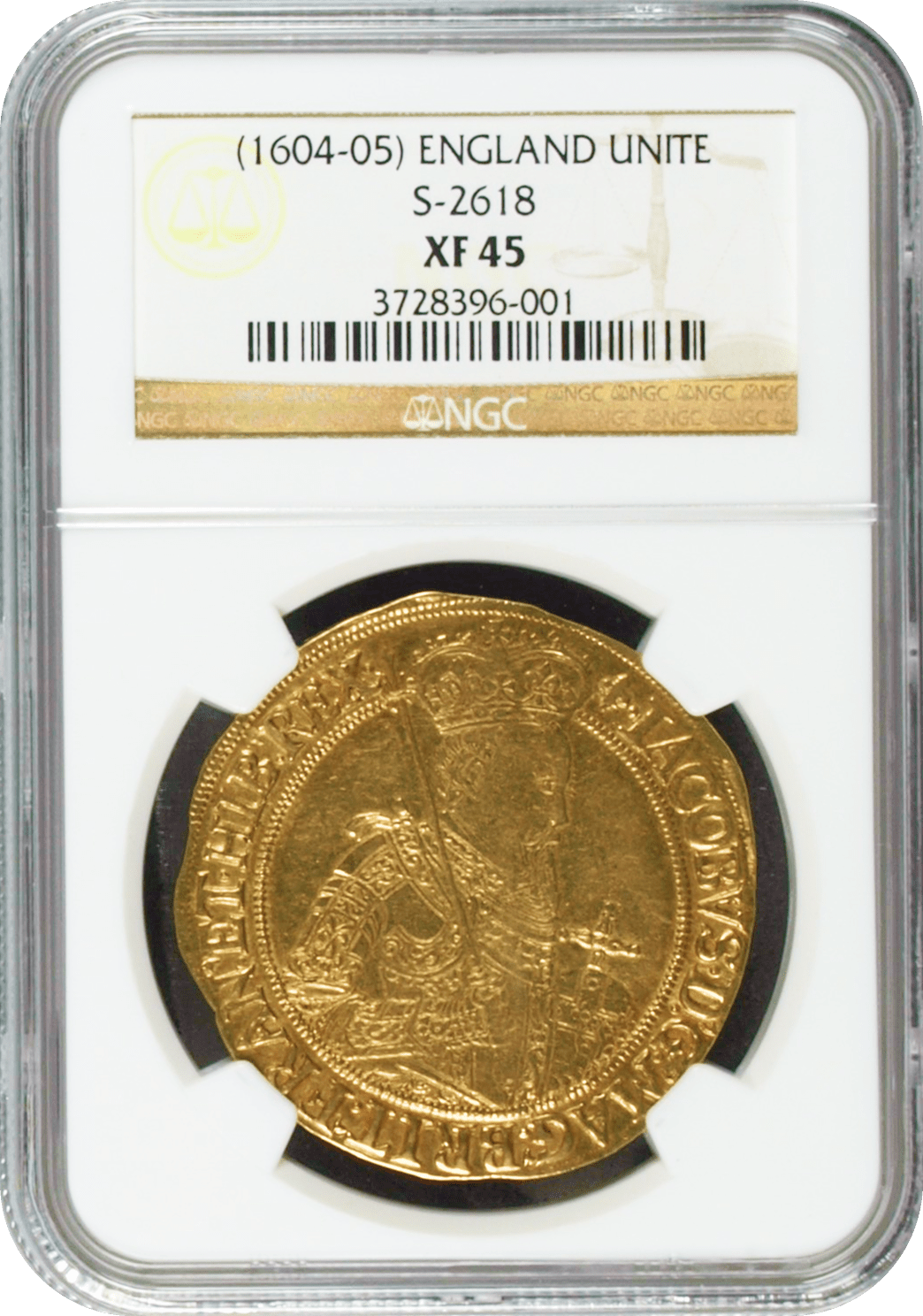 ユナイト金貨は「Unite(統合、合体)」の名の通り、ジェームズ1世がイングランド・スコットランド・フランス・アイルランドの「4国統一王」を自称し、その銘文がコインに刻まれていることに由来します。