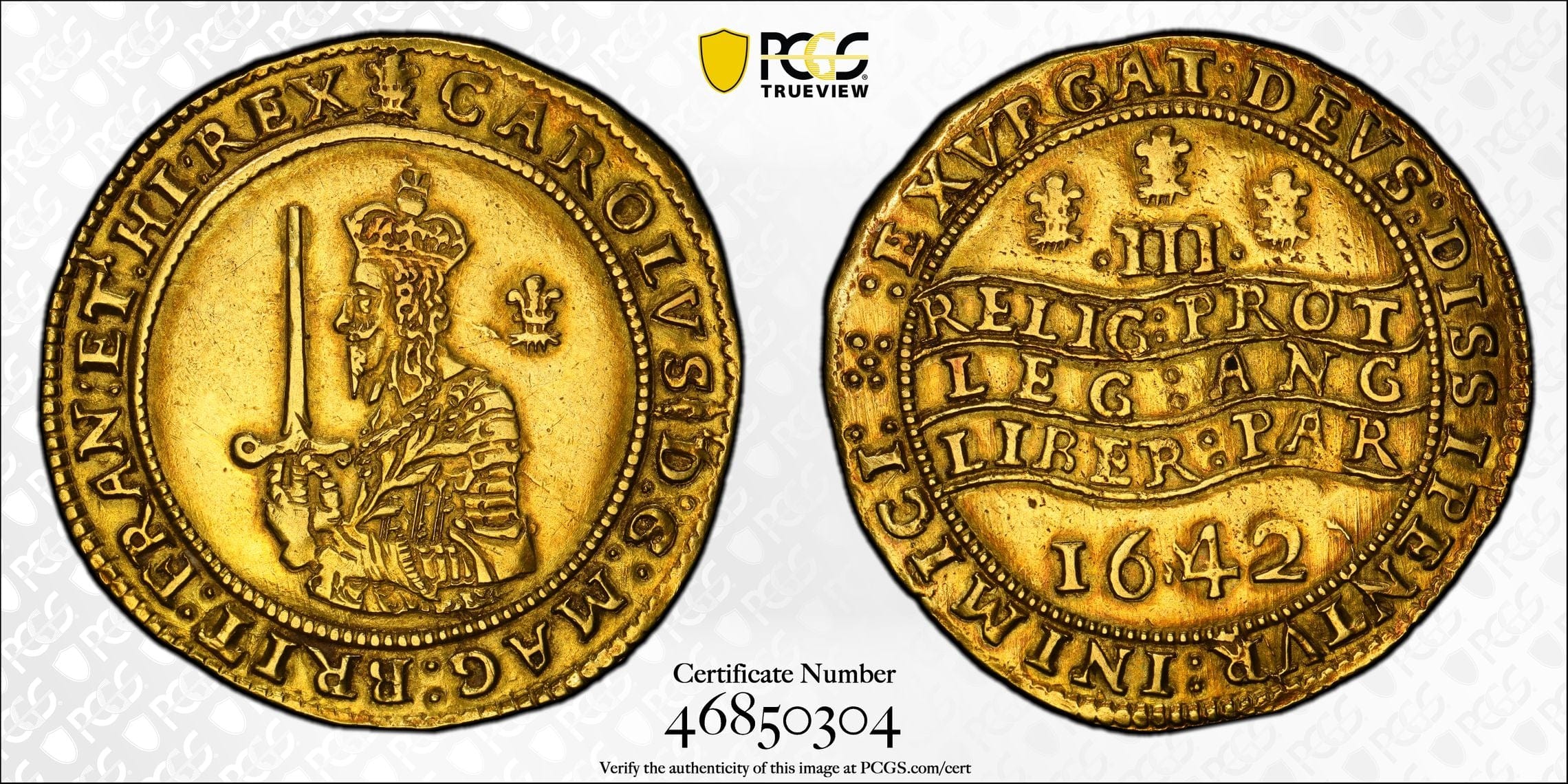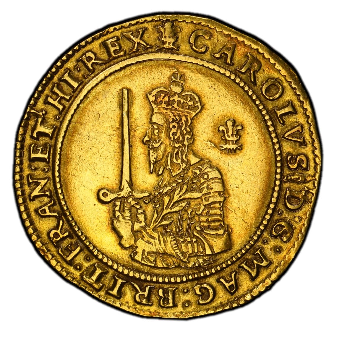 この金貨は、イングランド内戦のさなか、王党派の正統を示す象徴として発行されたものです。発行は1642年から1644年の僅か3年間に限られ、現存はおよそ250枚と推察されています。