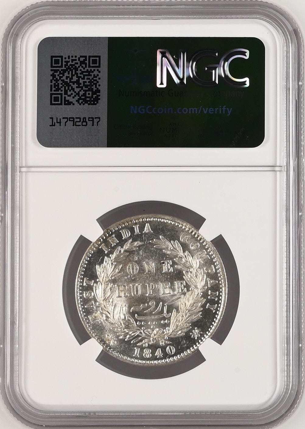裏面は花冠に囲まれた「ONE RUPEE」の文字を中央に配置し、上下に「EAST INDIA COMPANY」と発行年「1840」が刻まれ、東インド会社の威信を象徴しています。