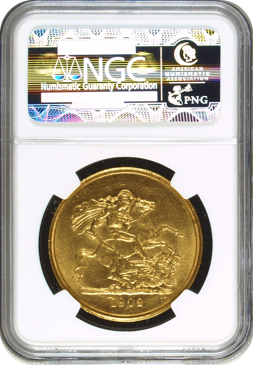 本コインの表面には、威厳あるエドワード7世の右向きの肖像、裏面にはセントジョージの竜退治という伝統的な意匠が施されています。