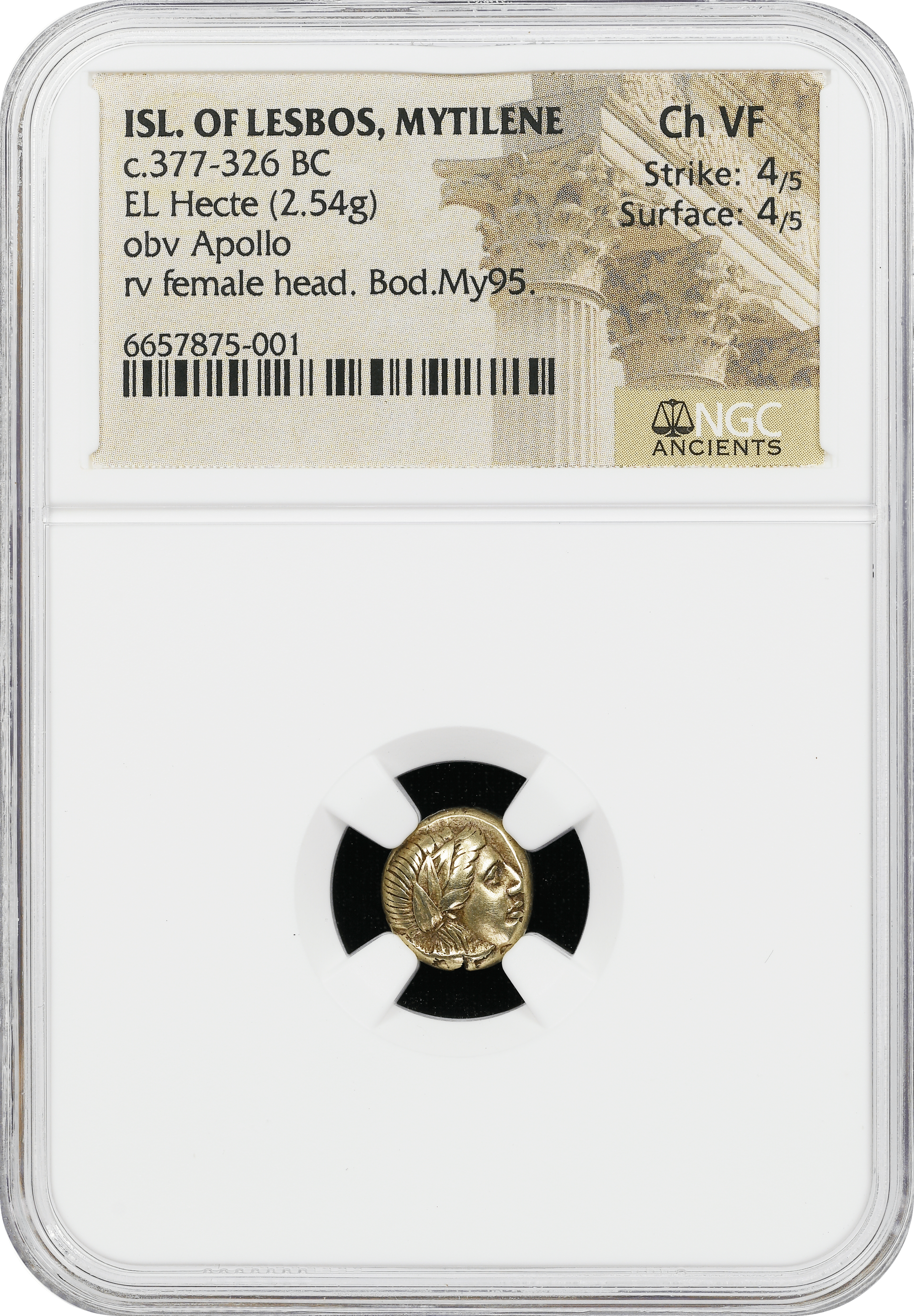 ミティリニは当時、豊かな文化と経済力を誇る都市国家でした。この金貨は、その繁栄を今に伝える、非常に魅力的な一枚です。