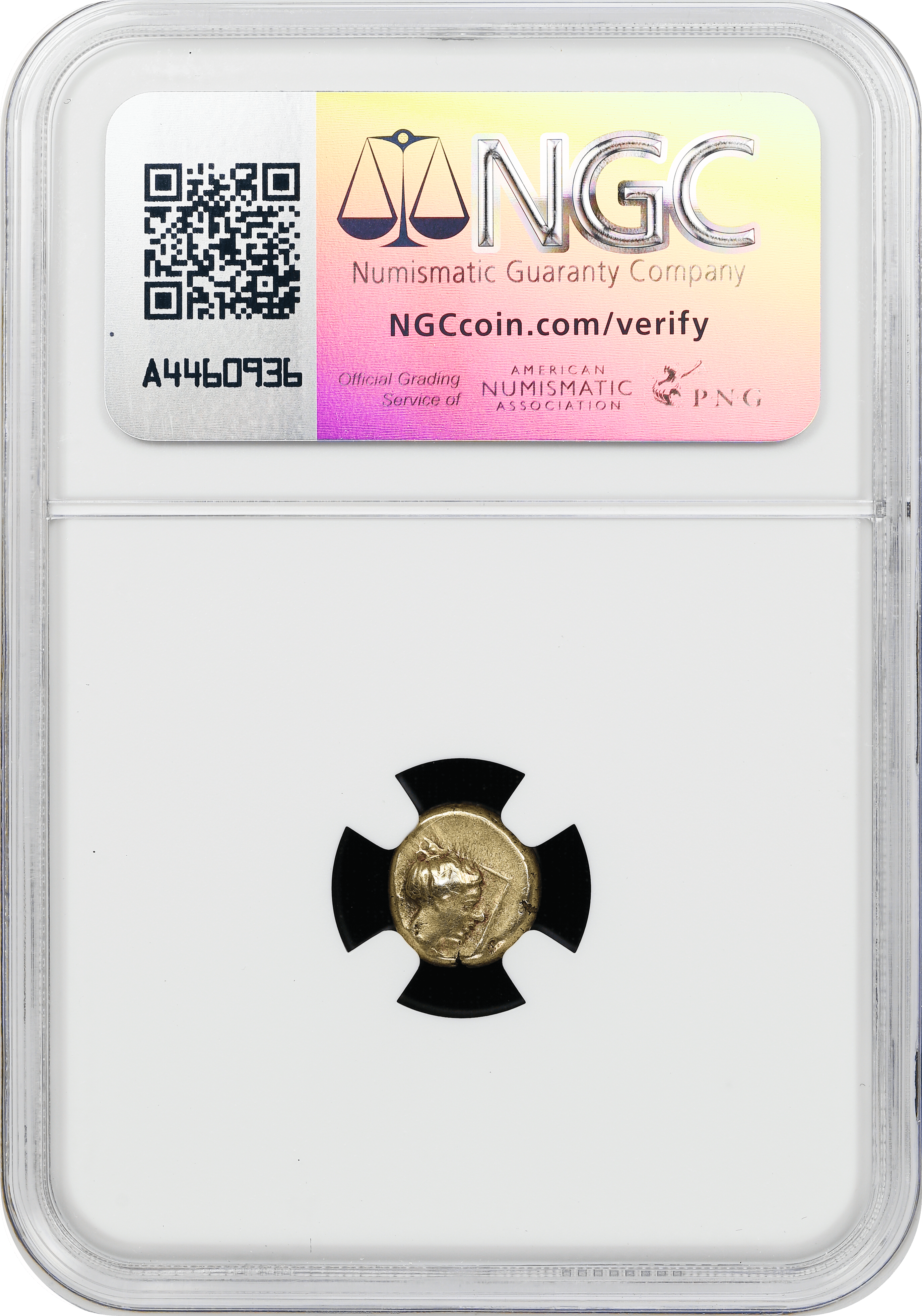 その政治・文化の中心であったミティリニで作られた1/6スターテルのエレクトラム(砂金などの自然金銀合金)貨です。