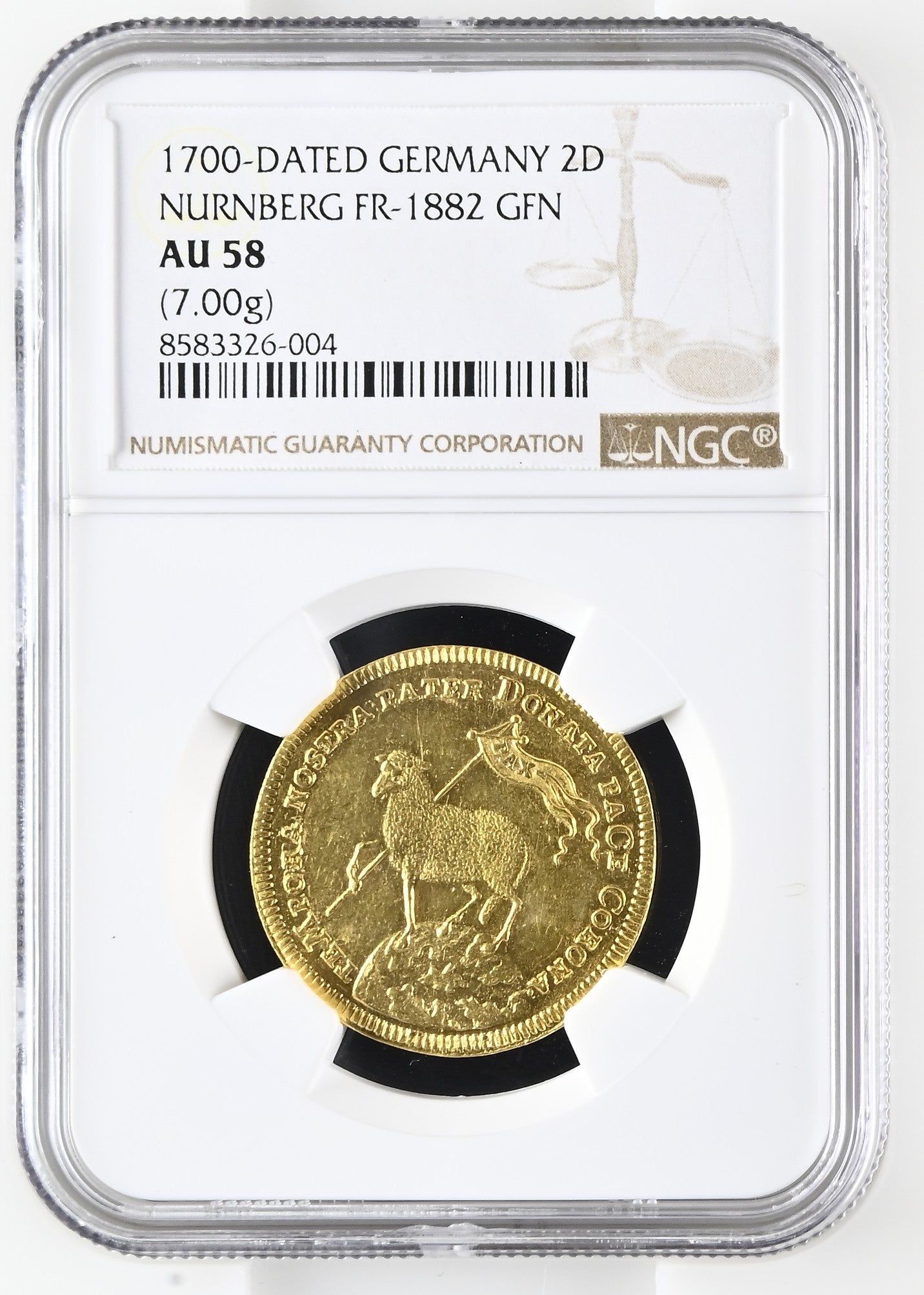 1700年、神聖ローマ帝国の自由都市ニュルンベルクで発行された通称「ラムダカット」と呼ばれる金貨です。表面には平和の象徴である「神の子羊」が旗を持つ姿が刻まれており、三十年戦争の惨禍を目の当たりにした人々の平和への願いが込められています。