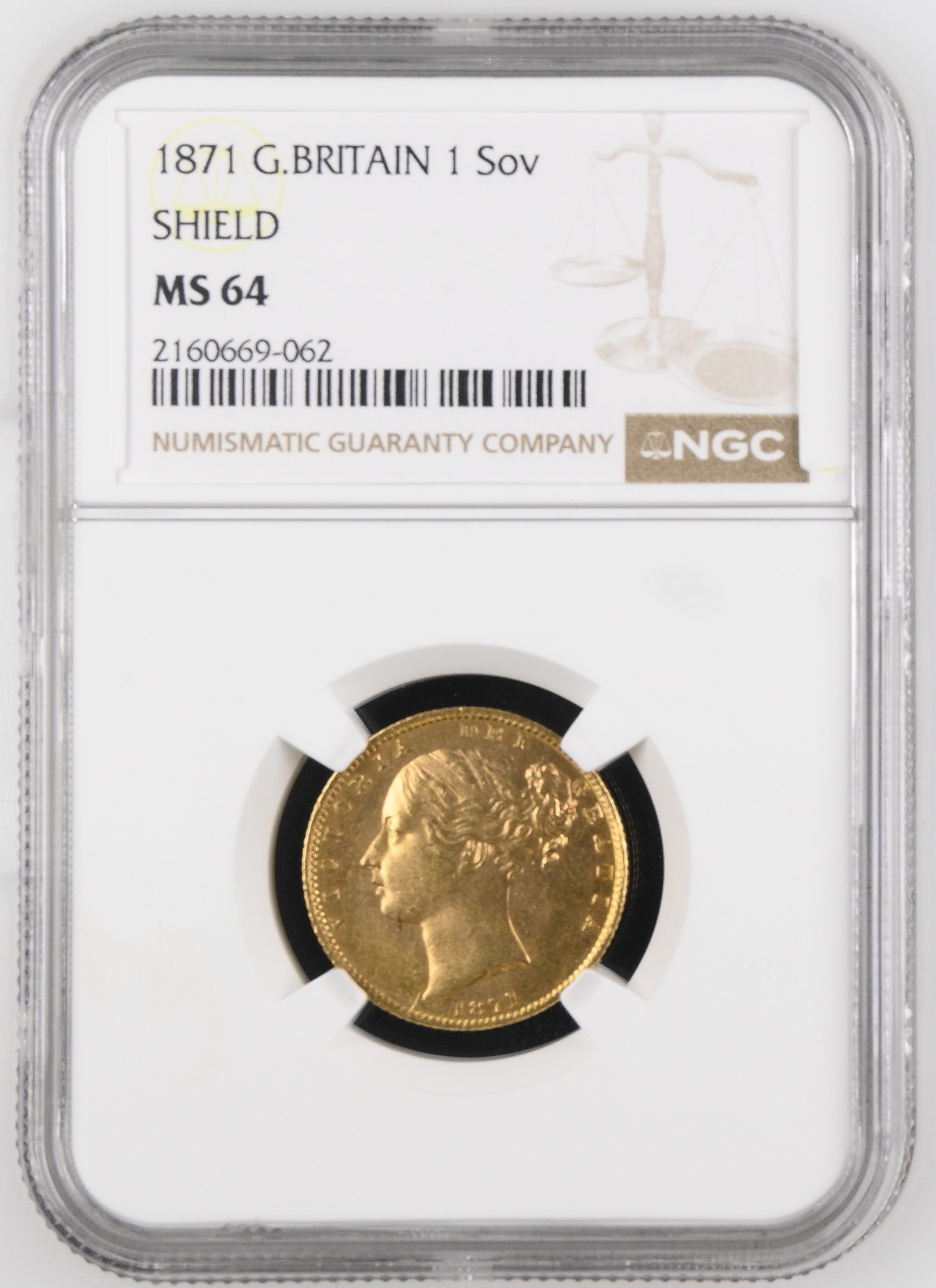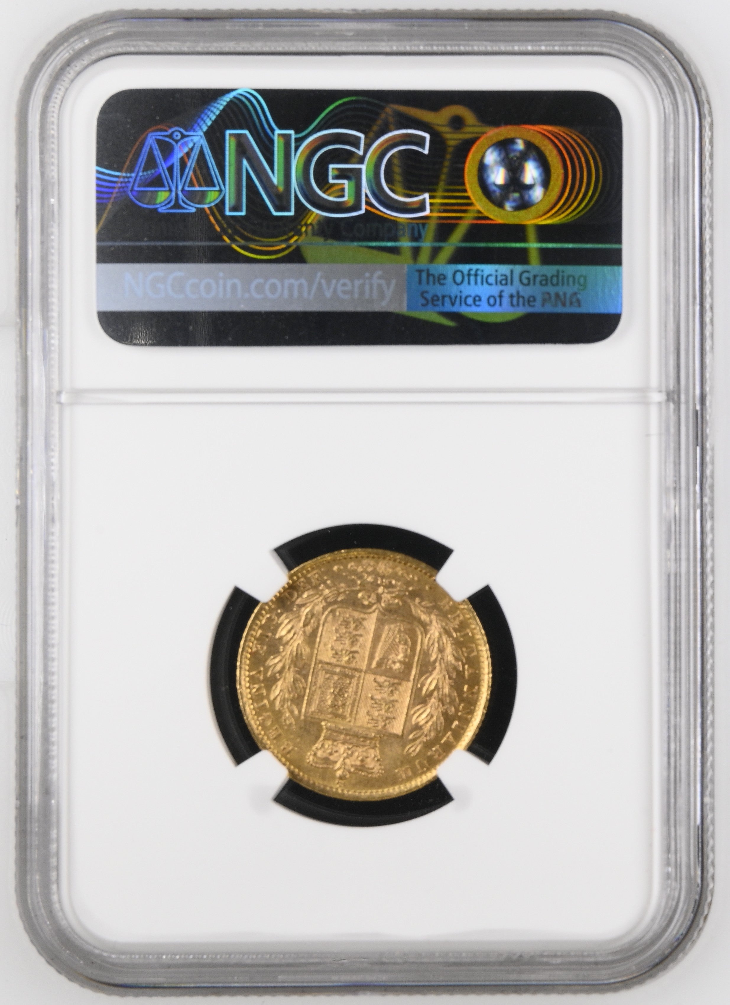 ヤングヴィクトリアの横顔とシールドの美しさから、ソヴリン金貨の中でも人気の高い1枚です。MS64という高水準のグレードも魅力。