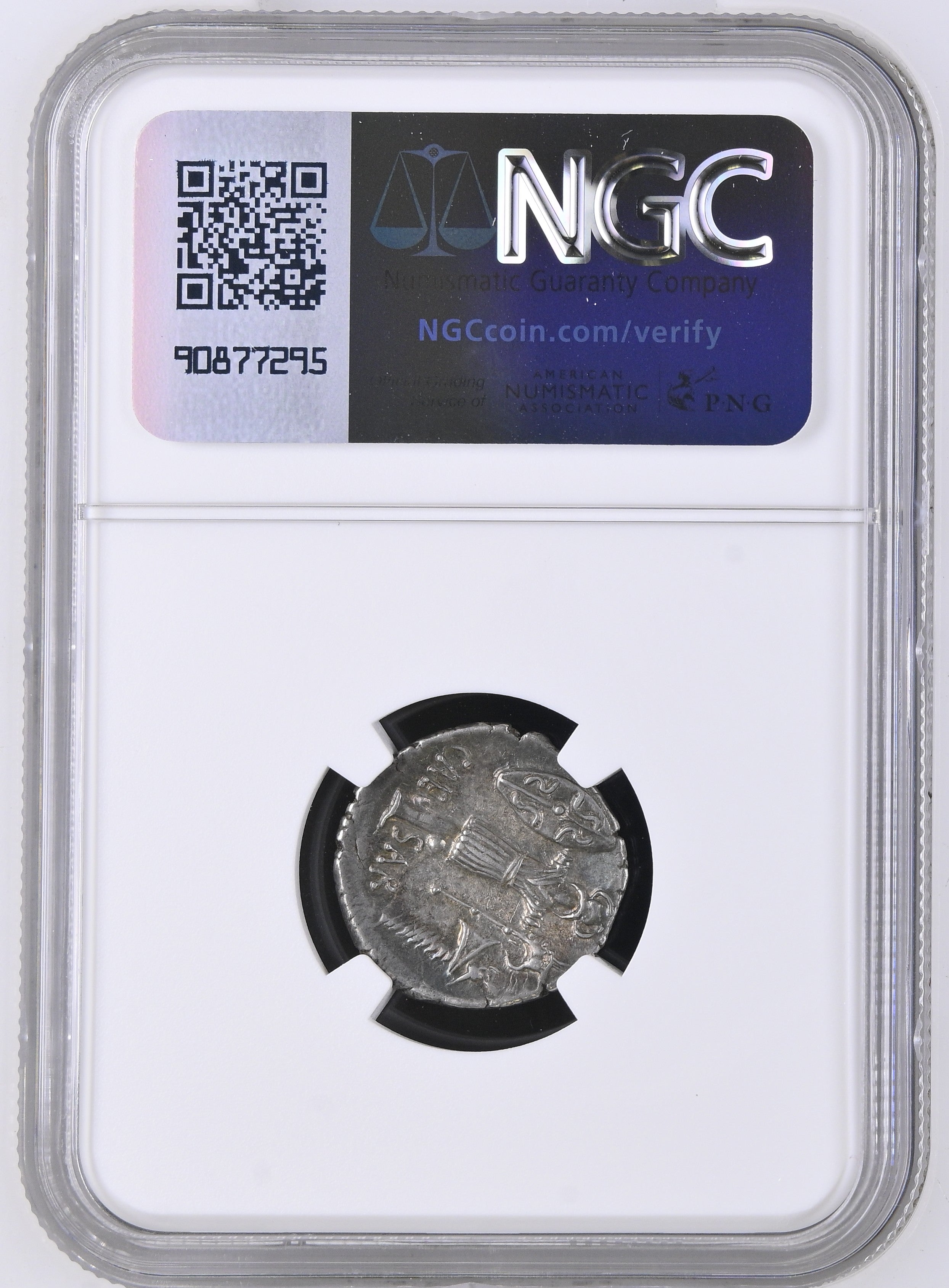 紀元前48〜47年、カエサルがかつてともに三頭政治を執り行った好敵手・ポンペイウスを破った内戦期に発行されたデナリウス銀貨です。